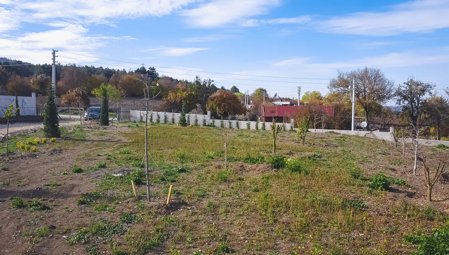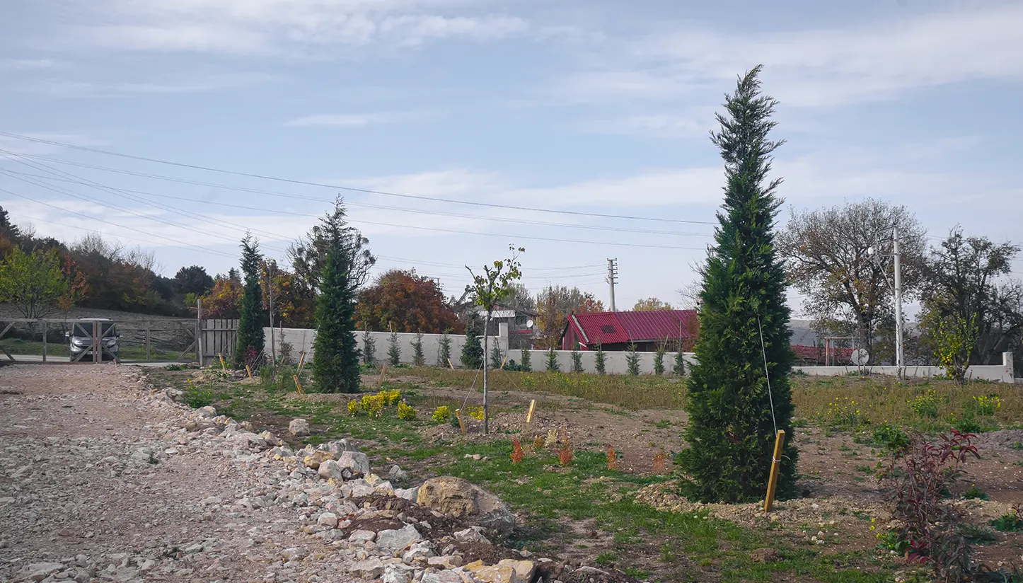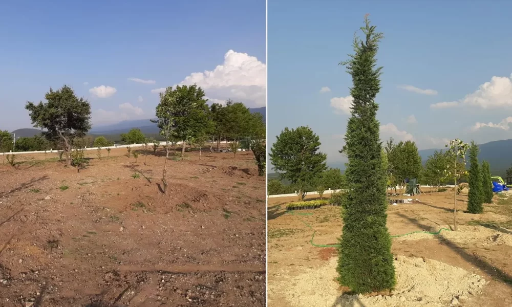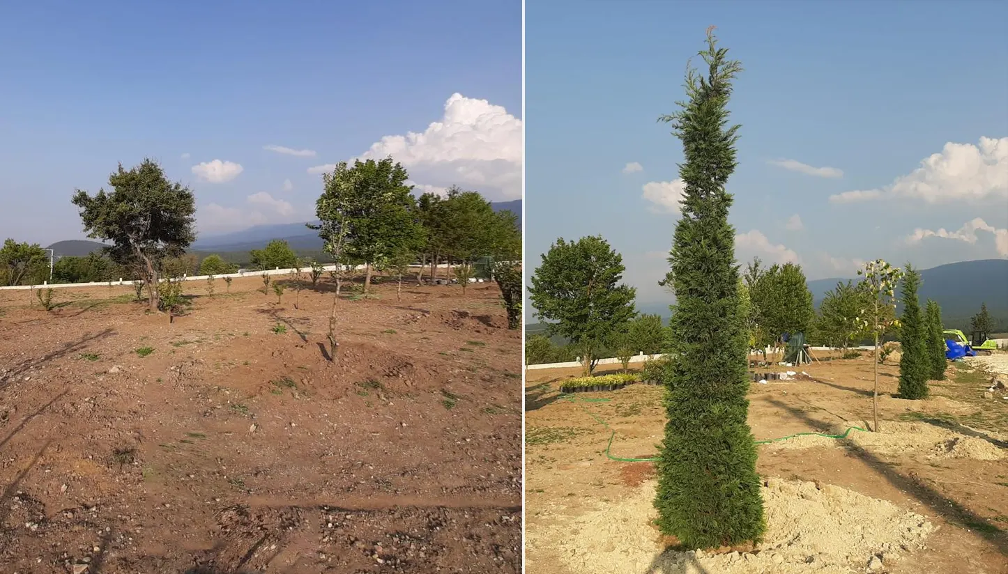 Arazi 1000m2 villa 6000m2 toprak araziden oluşmaktadır. Villa bahçesi için yapılan peyzaj projemizde ilk olarak 7000m2’lik araziyi çevreleyen 3,5m yükseklikteki beton çevre duvarlarını oluşturduğu soğuk görüntüyü absorbe etmekti. Daha etkileyici bir görüntü elde etmek için bahçe ve villa girişi arasına bulunan 60m’lik bir yol çalışması yapıldı. 6000m2’lik toprak arazinin müşterimizin isteği üzerine büyük bahçenin bir kısmı meyve bahçesi olarak düzenlendi ve %15’lik kısmına meyve ağaçlarının dikimi, hiza durumu ve planlanması tamamlandı. Arazi yüzeyini peyzaj ve düzenleme için ilk olarak tesviye çalışması yapıldı. Alandaki kötü görüntü sağlayan ve kullanıma engel olan taşlar ve toprak zemin dikime hazır hale getirildi. Villa bahçesinde ön bitkilendirme çalışması yapıldı.Bitkilendirme ve Ağaçlandırma çalışmasında kullanılanlar;