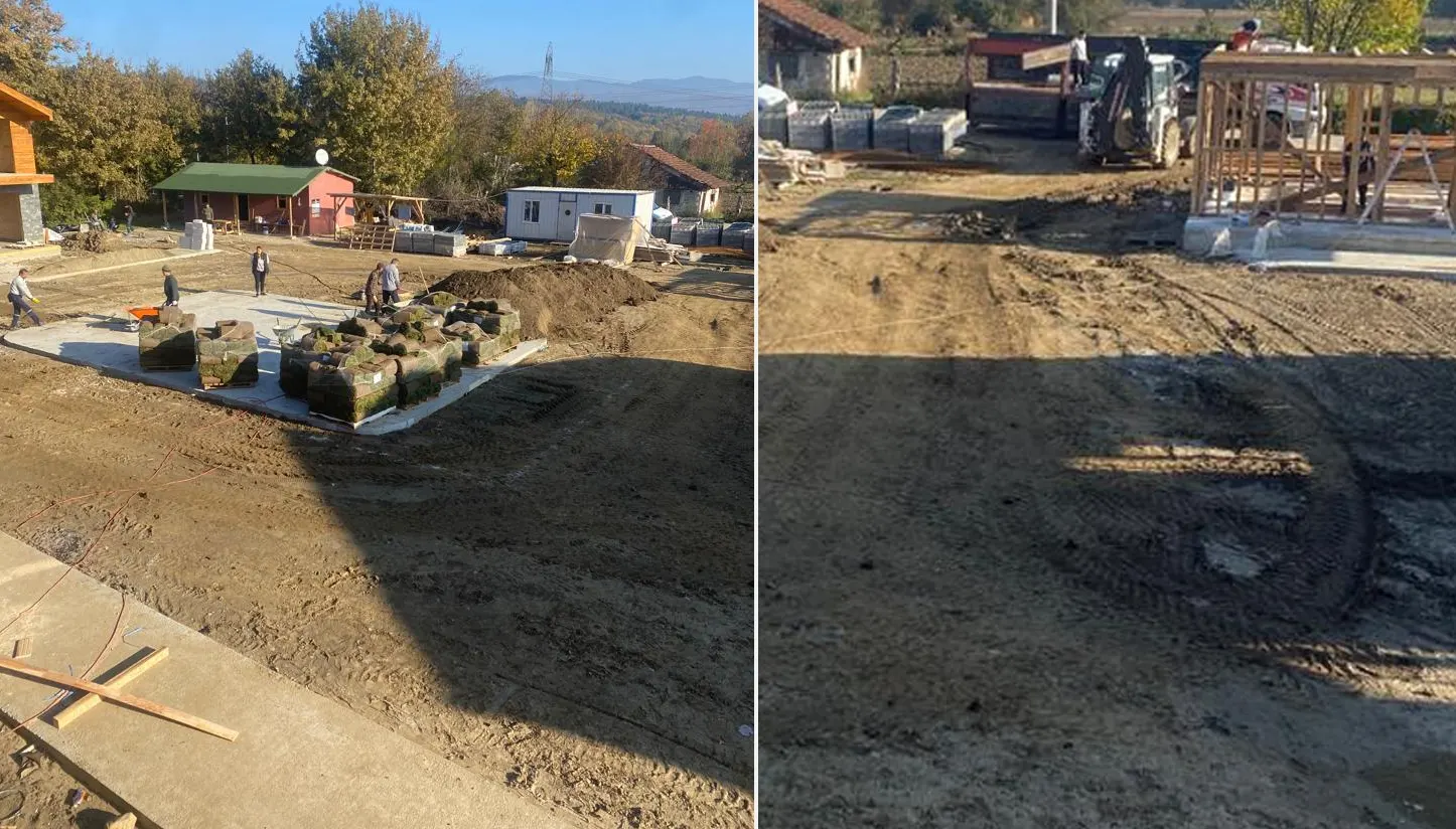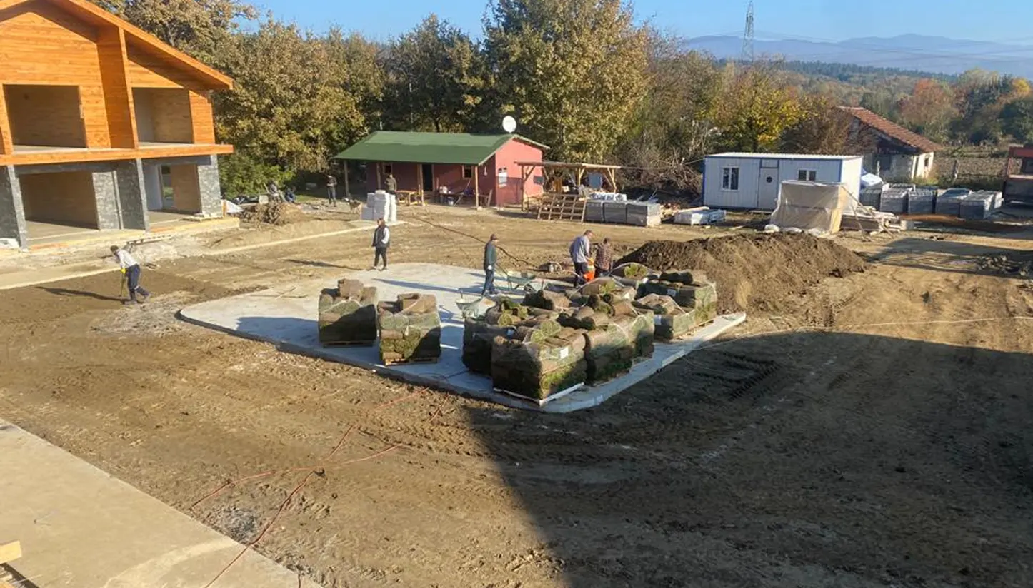 Yeni yapılan bungalov evlerin orta alanına oturma ve dinlenme kısmı hazırladık. Peyzaj düzenlemesi yapılacak kısma önce elenmiş toprak İle tesviye ardından silindir yardımı ile düzgünleştirme işlemi yapıldı. 550m2 Rulo çim uygulaması ile düzenleme gerçekleşti