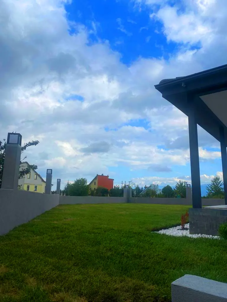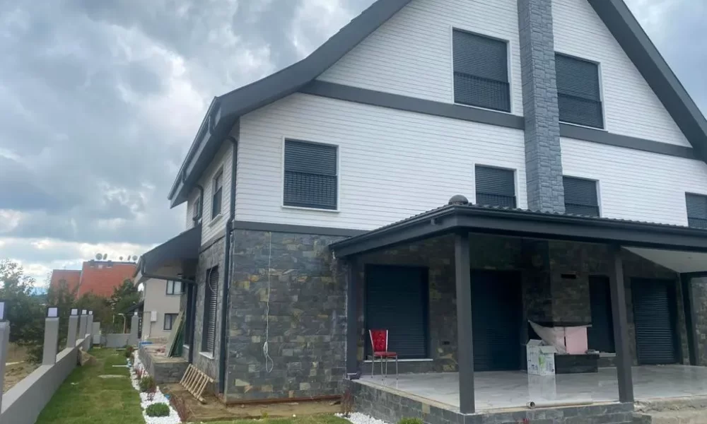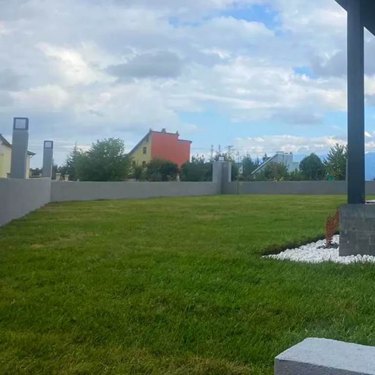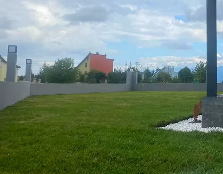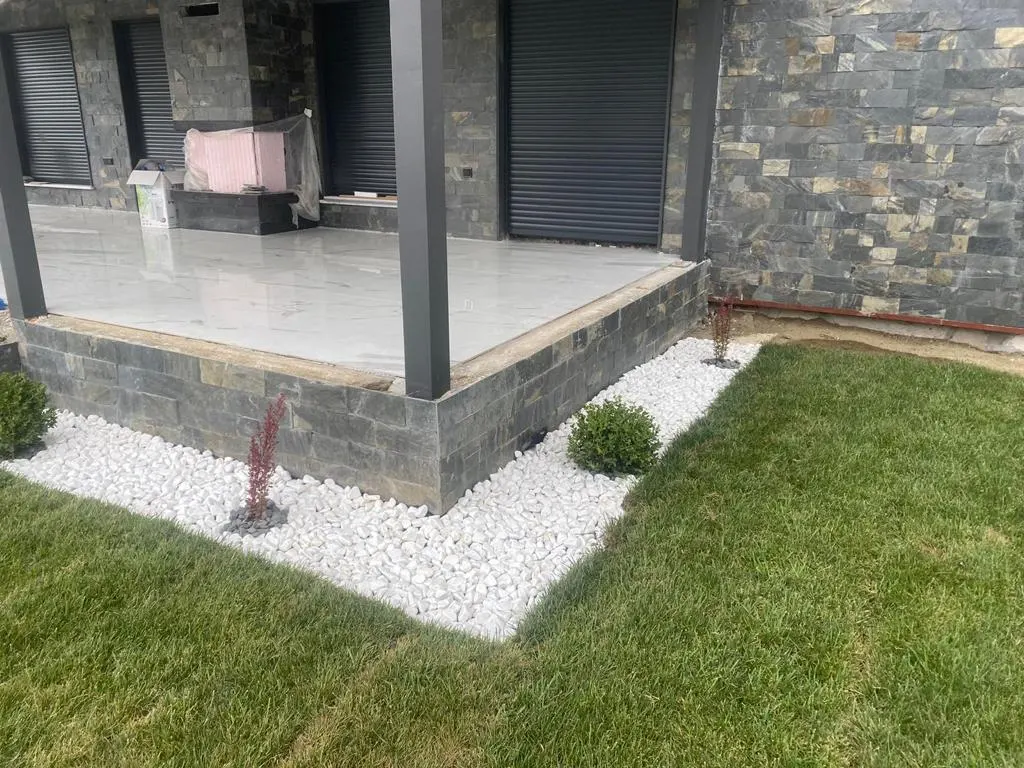 330 m2 den oluşan bu bahçede 1 adet saklım söğüt, 1 adet oya çalısı dışında top şimdir ve berberis kullanılmıştır. Müşterimizin talebi üzerine bir kaya bahçesi hazırlanıp içerisine bambu ve gül eklenerek peyzaj uygulaması ve tasarımı yapılmıştır. Genel olarak giriş kısmını vurgulamamak adına top şimşir ve berberisler bir hat halinde dikilip dipleri beyaz dolamit ve bazalt taşlarda düzenmiş ortalama 290 m2 alan ise serme çim uygulaması ile tamamlanmıştır. Otomatik sulama sistemi arası tesviyesi sırasında hazırlanıp uygulanmış olup Rain bird marka ürün kullanılmıştır.